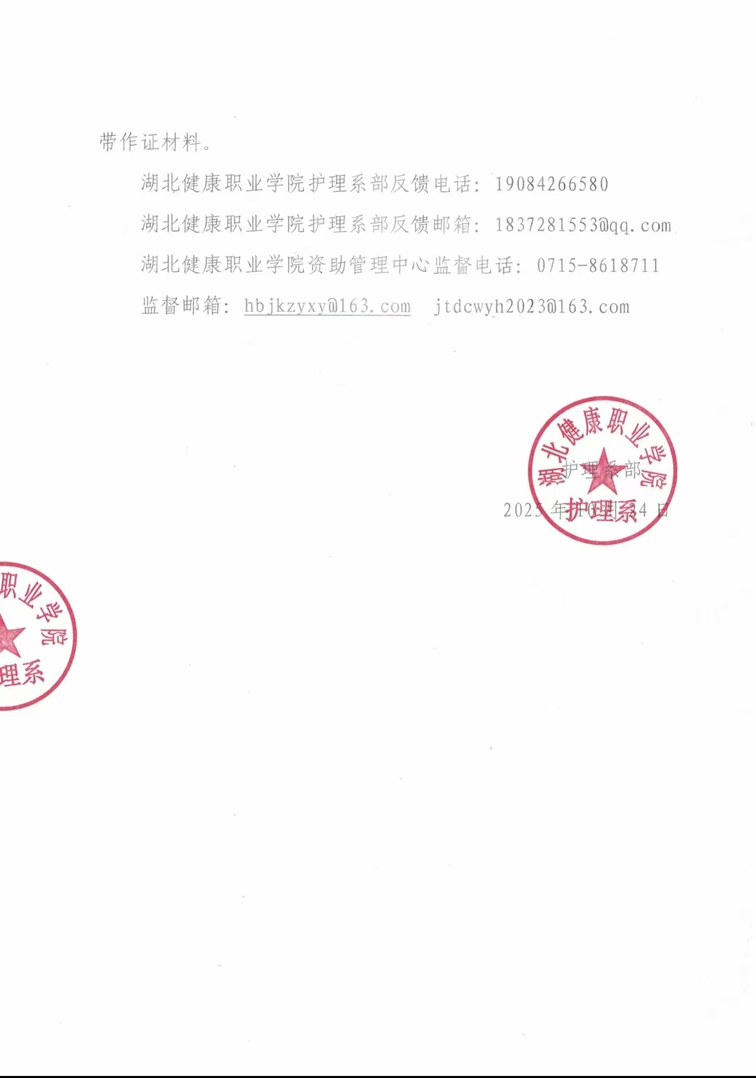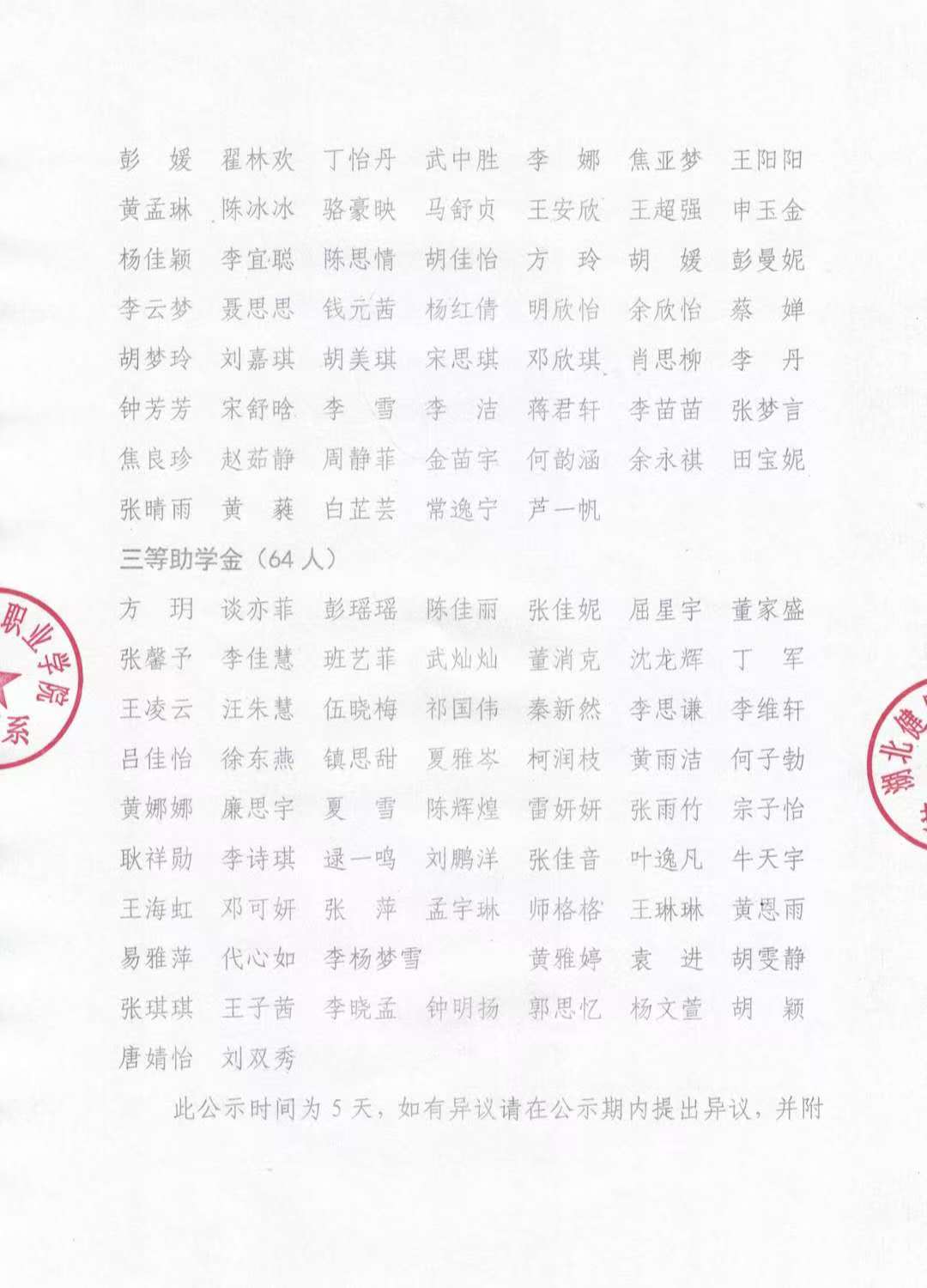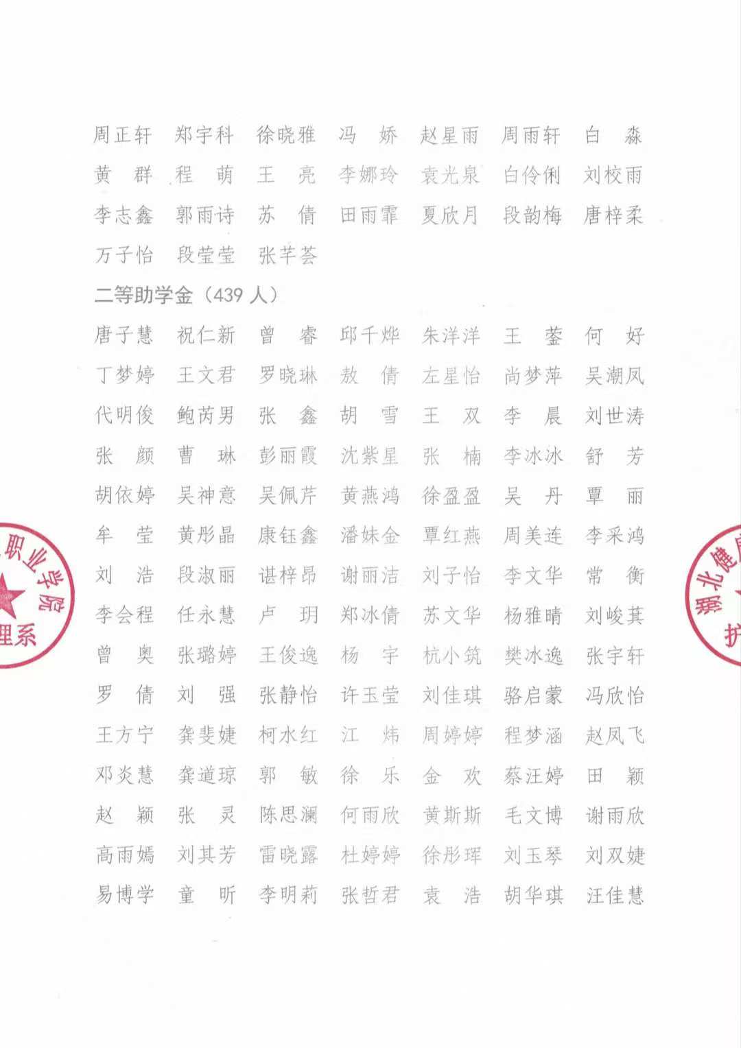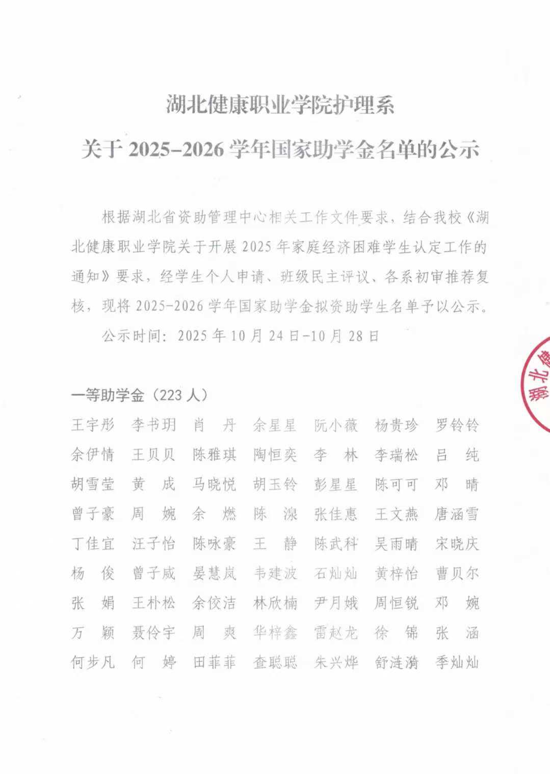 湖北健康职业学院护理系关于2025-2026学年国家助学金名单的公示