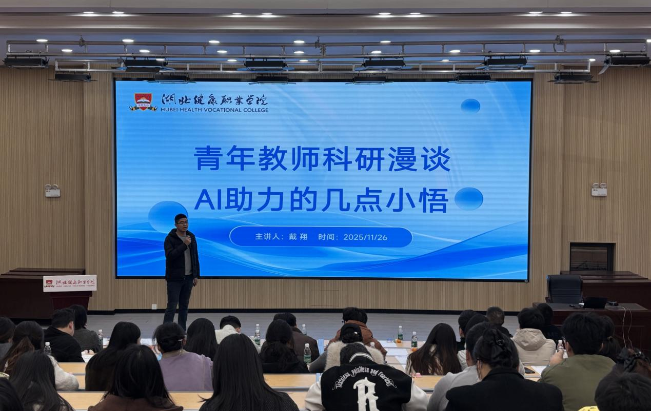 11月26日下午,我校教务部在四号教学楼一楼报告厅举办2025年秋季学期第三期学术沙龙活动,本次活动以“AI助力青年教师科研创新实践”为主题,特邀卫生健康系教师戴翔主讲。戴翔结合自身科研实践,从AI应用历程、案例解析、工具矩阵及实用技巧等维度,为青年教师带来一场兼具理论深度与实操价值的科研赋能分享。